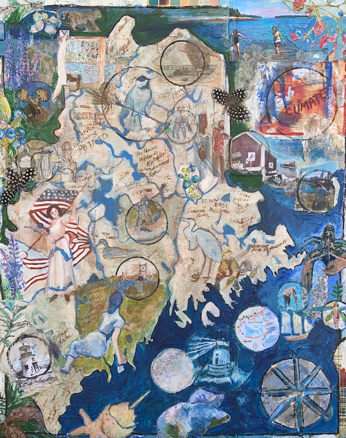 One female cartographer and artist was a Mainer, Mildred Giddings Burrage. She was born in Portland in 1890 and died at the age of 93. Burrage had an extraordinary career and life throughout the 20th century. Her body of work includes historical maps, impressionist paintings, and patriotic posters. She was also influenced by Jackson Pollack’s unique style of abstract action paintings.